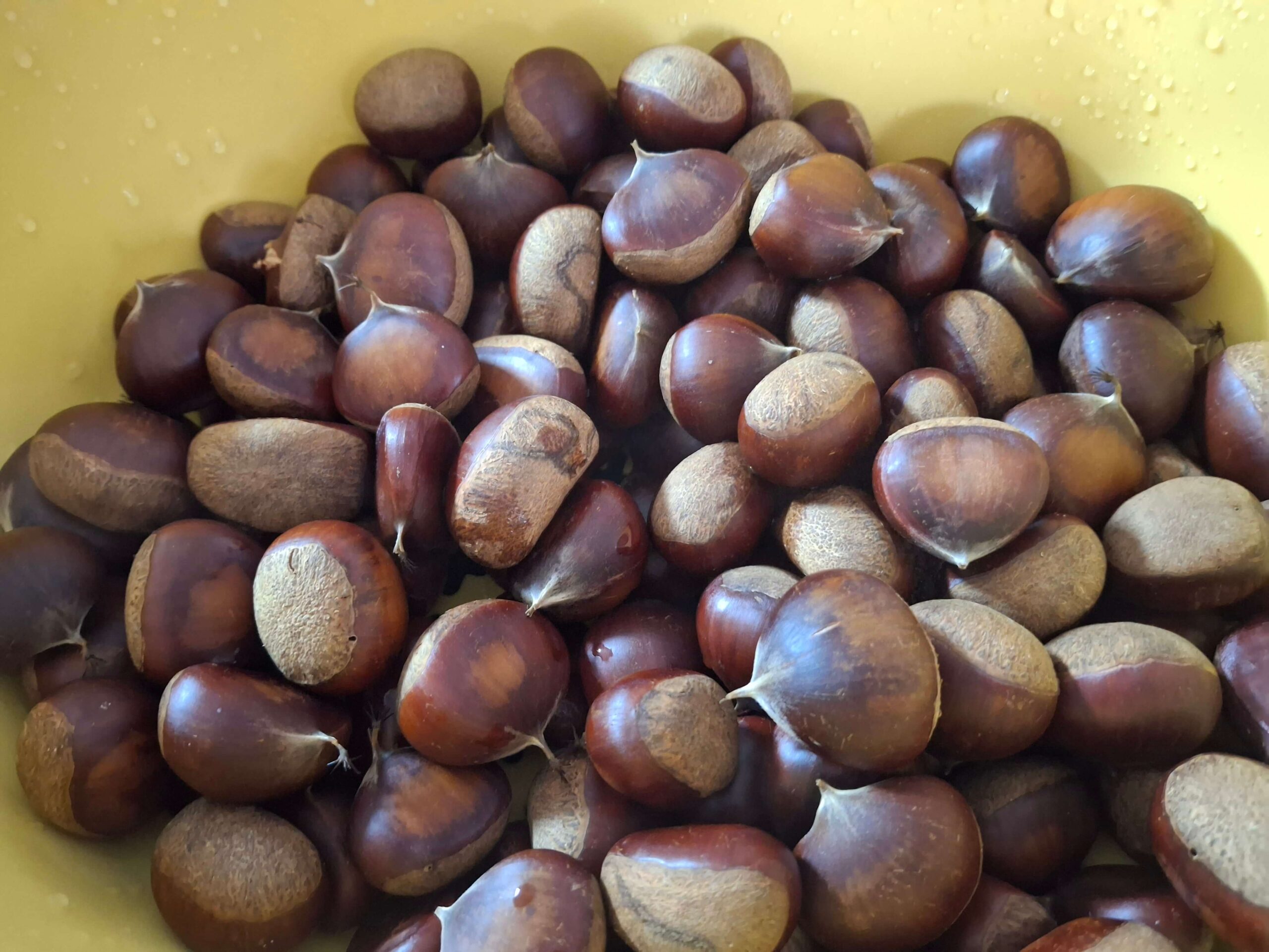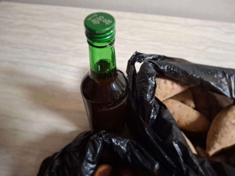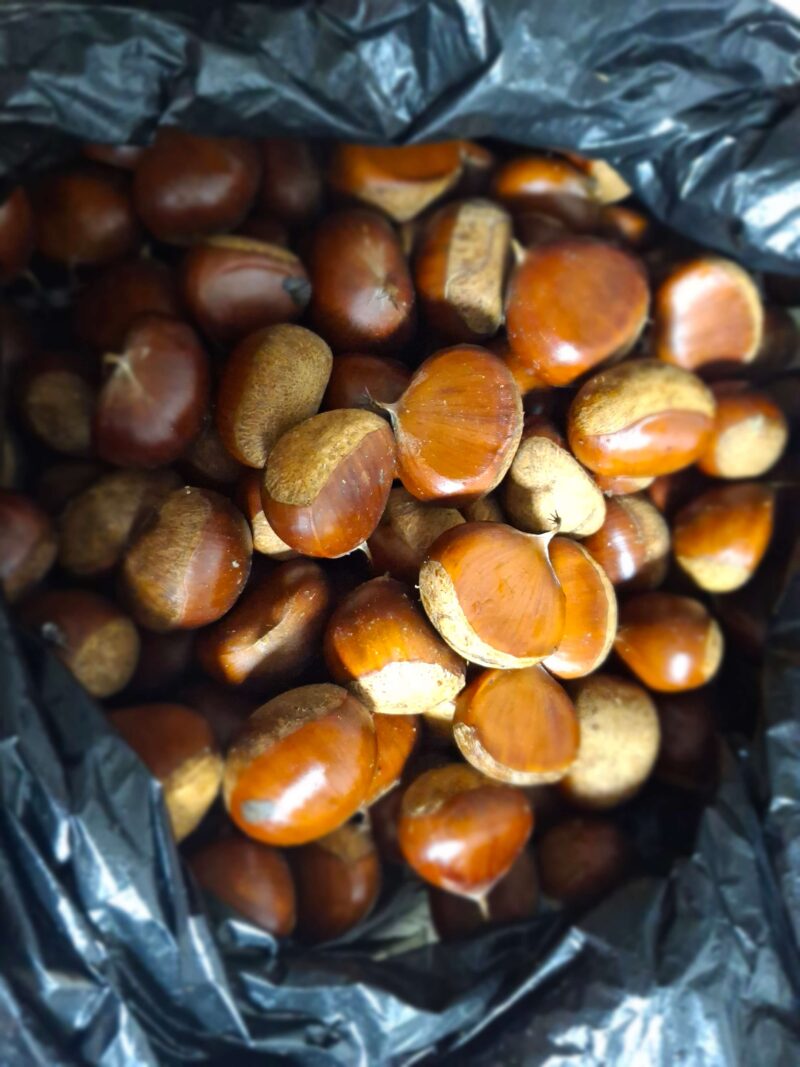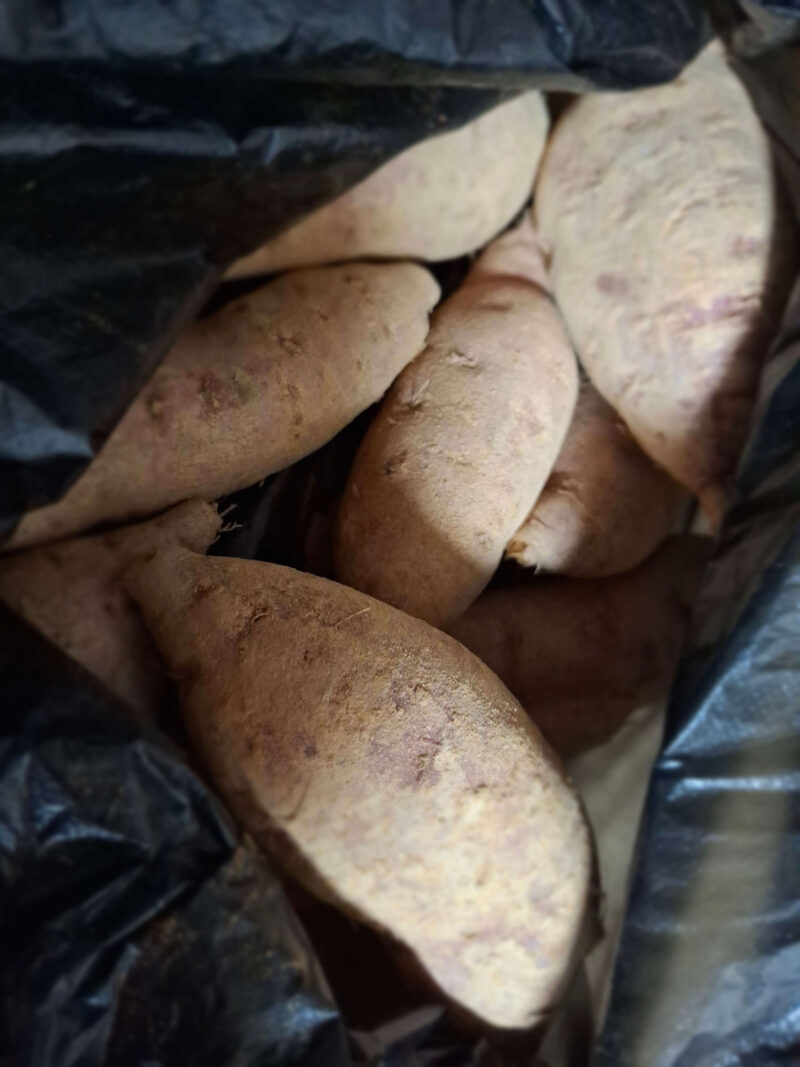 비닐봉지 안에는 갓 수확한 햇고구마, 햇밤,