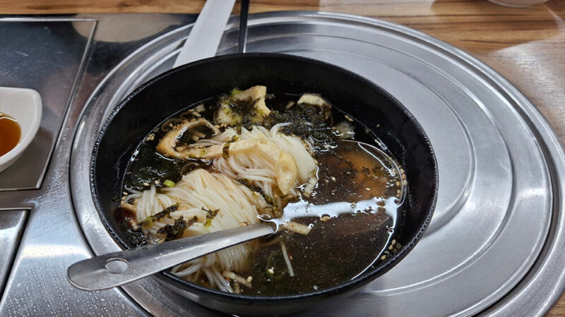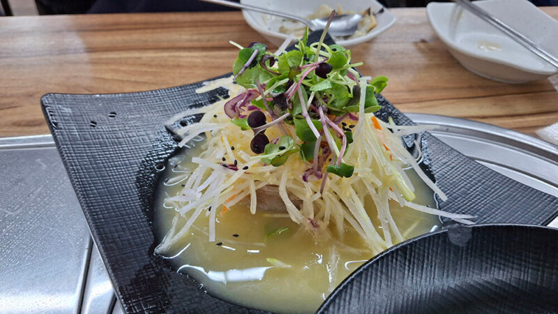 잔치국수: 멸치 육수 베이스로 국물이 맑고 깔끔한데, 따뜻한 온도로 나와서 속이 풀리는 느낌이었어요. 국물만 계속 떠먹다 보니 금세 배가 불러버렸습니다. 나중을 위해 잔치국수는 조금만 드세요. 나중에 배불러서 못먹습니다.